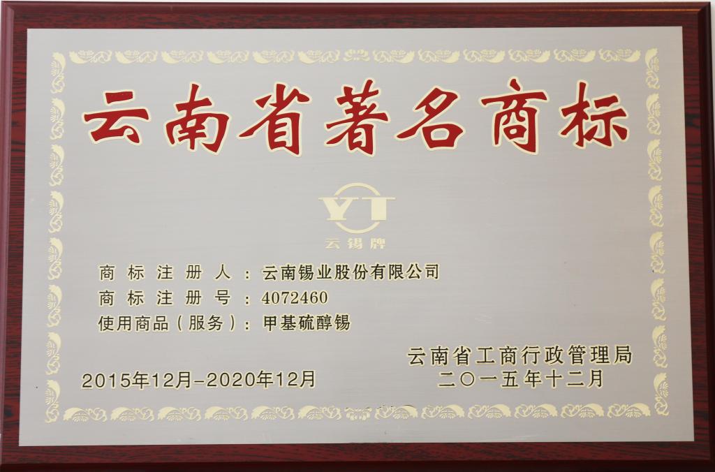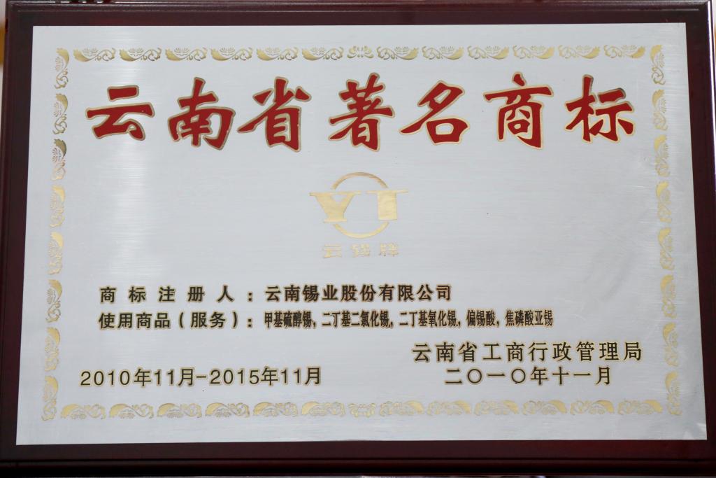甲基硫醇锡、二丁基二氧化锡、二丁基氧化锡、偏锡酸、焦磷酸亚锡为云南省著名商标