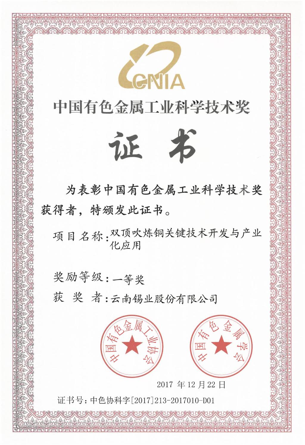 中国有色金属工业科学技术奖一等奖