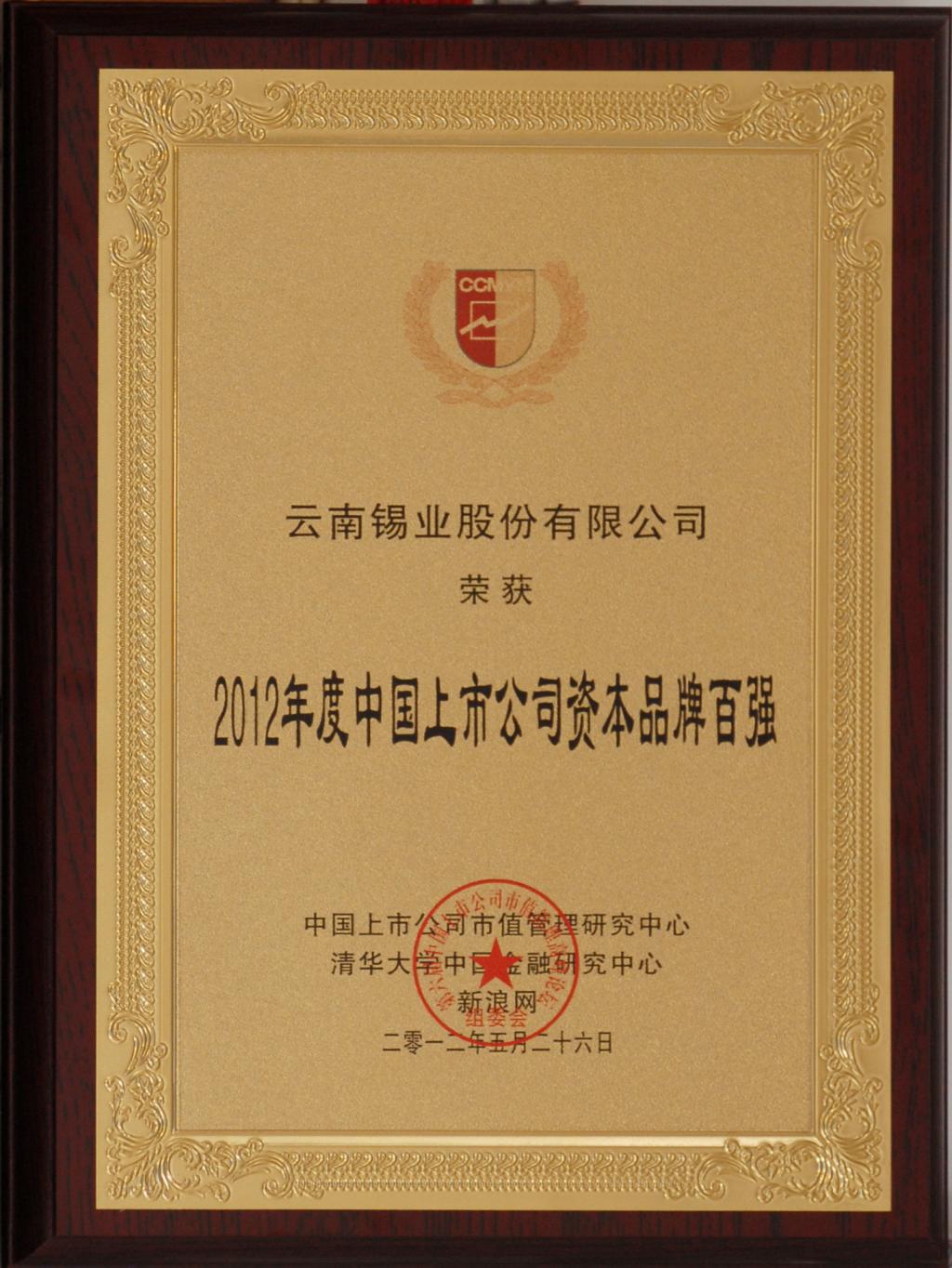 荣获“2012年度中国上市公司资本品牌百强”