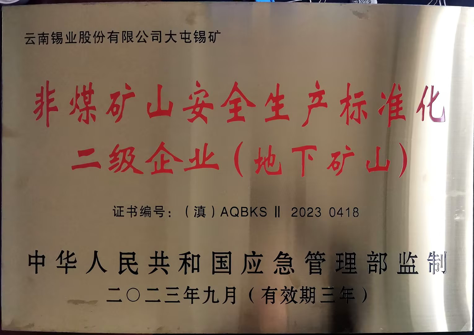 近日,sunbet申搏卡房分公司、大屯锡矿两家单位收到由中华人民共和国应急管理局监制、云南省应急管理厅颁发的牌匾和证书,正式确认为“非煤矿山安全生产标准化二级企业”,为今后持续稳定发展打下良好基础。
