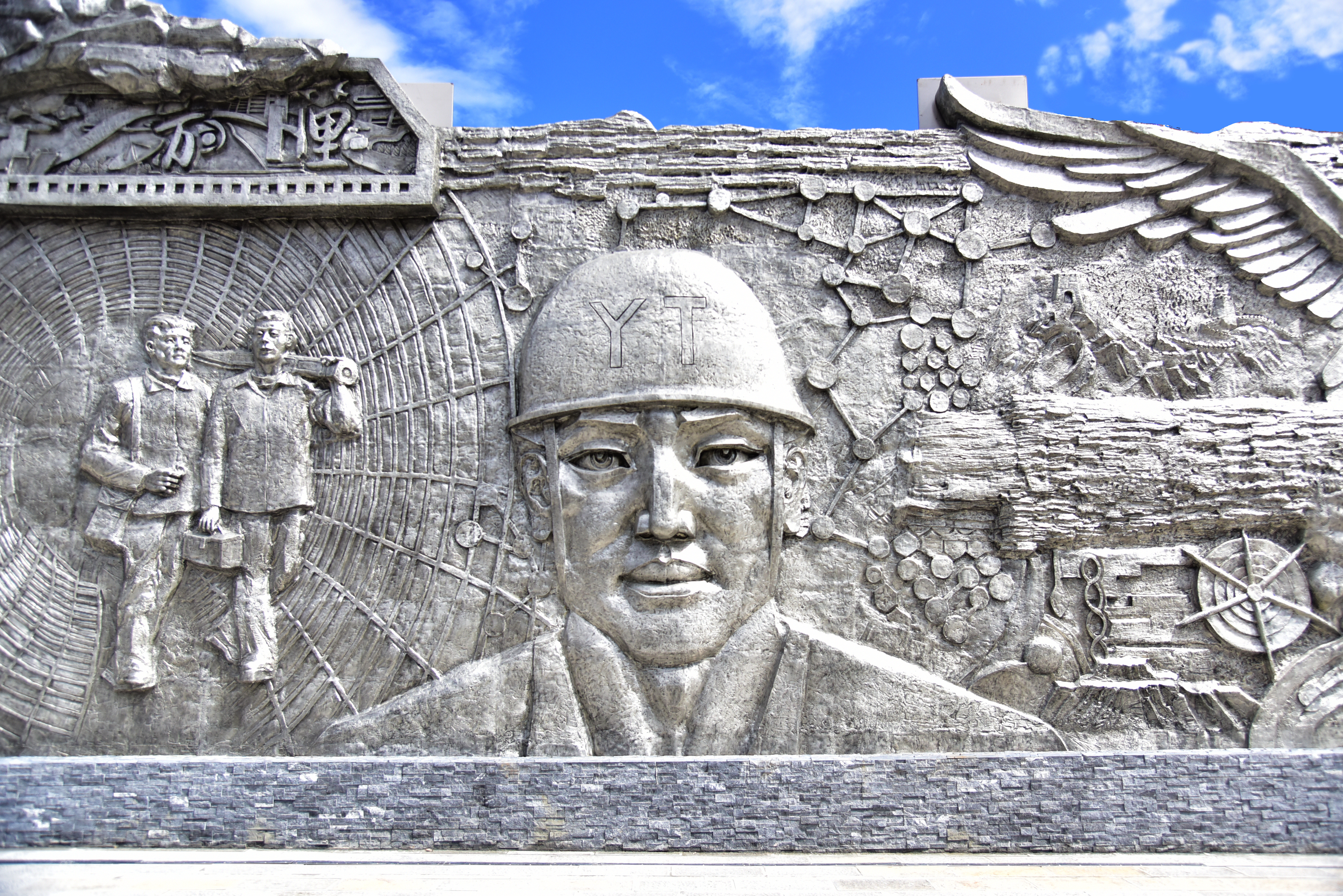 目光如炬的新时代云锡产业工人、尽显家乡民族文化的哈尼梯田、代表美誉溅满中国乃至世界的锡水、艰苦创业的古时锡业人穿越时空走进新云锡、锡产品在高铁和航天产品等行业的广泛运用、助力云锡快速发展的大型工业设备、寓意云锡技术进步的齿轮、寓意云锡全球化发展的地球、寓意引领全球锡业而展翅高飞的雄鹰、高举“YT”品牌以更宽视野注目着未来的云锡人……在以英文字母“T”为中轴的右侧主题浮雕墙上,一组组极具真实感的画面仿佛在描绘着 “云腾万里”的豪迈。
