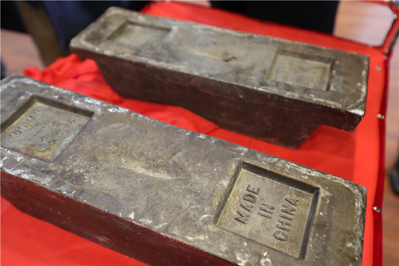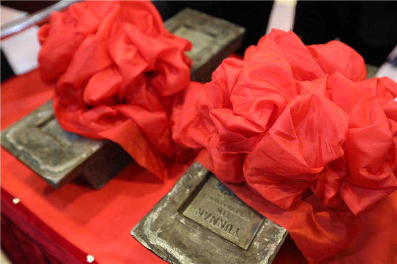 云南环世矿业有限公司向云南锡博物馆捐赠民国时期云南炼锡公司所生产的锡锭,sunbet申搏副总经理浦承尧与云南环世矿业有限公司董事长涂世林共同为锡锭揭开红绸。