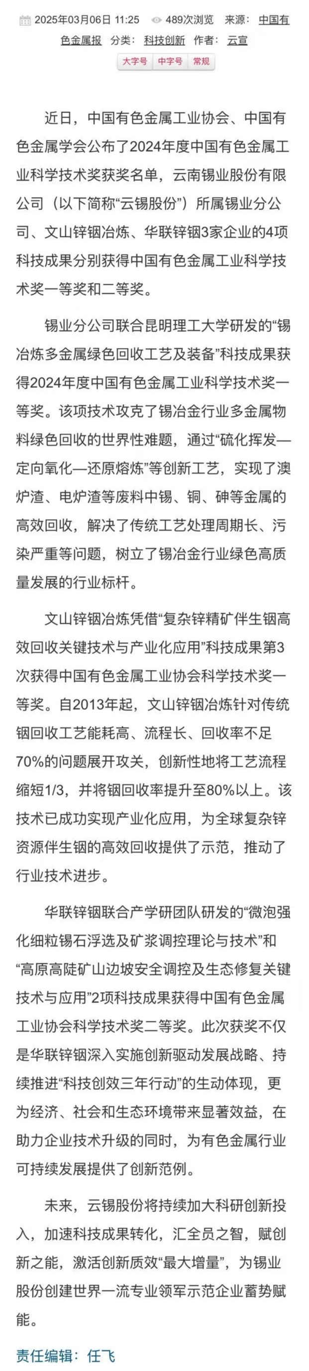 中国有色金属报:云锡股份所属企业4项科技成果获2024年度中国有色金属工业科学技术奖