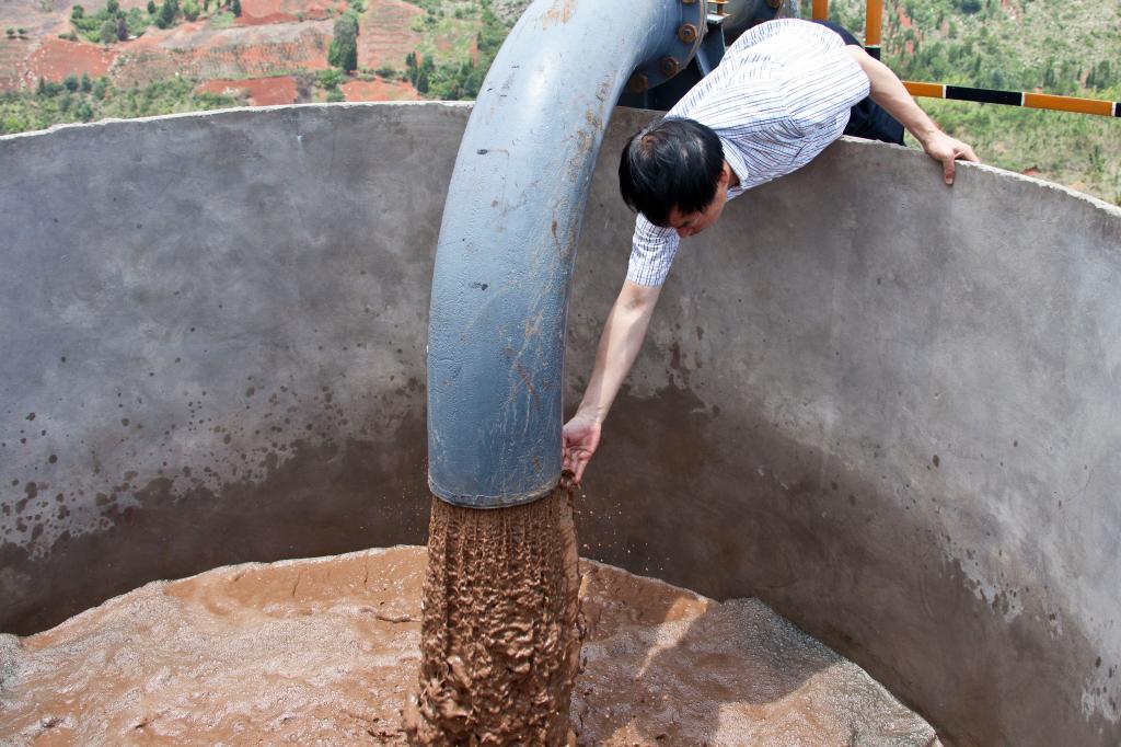 12时40分左右,17米多高的花坟二次浓缩塔缓冲池旁,站满了施工及前来目睹第一管尾矿输出的各路人马,人们默默地屏住呼吸,神色凝重地盯着输送管的出水口。13时整,输送管存水由清渐浊,随着几声“扑通、扑通”的声响,尾矿泥浆以“浓浓”的情意、像带着人们的重托和长久期盼,由输送管道远远奔腾而来,畅快地一泄而出……