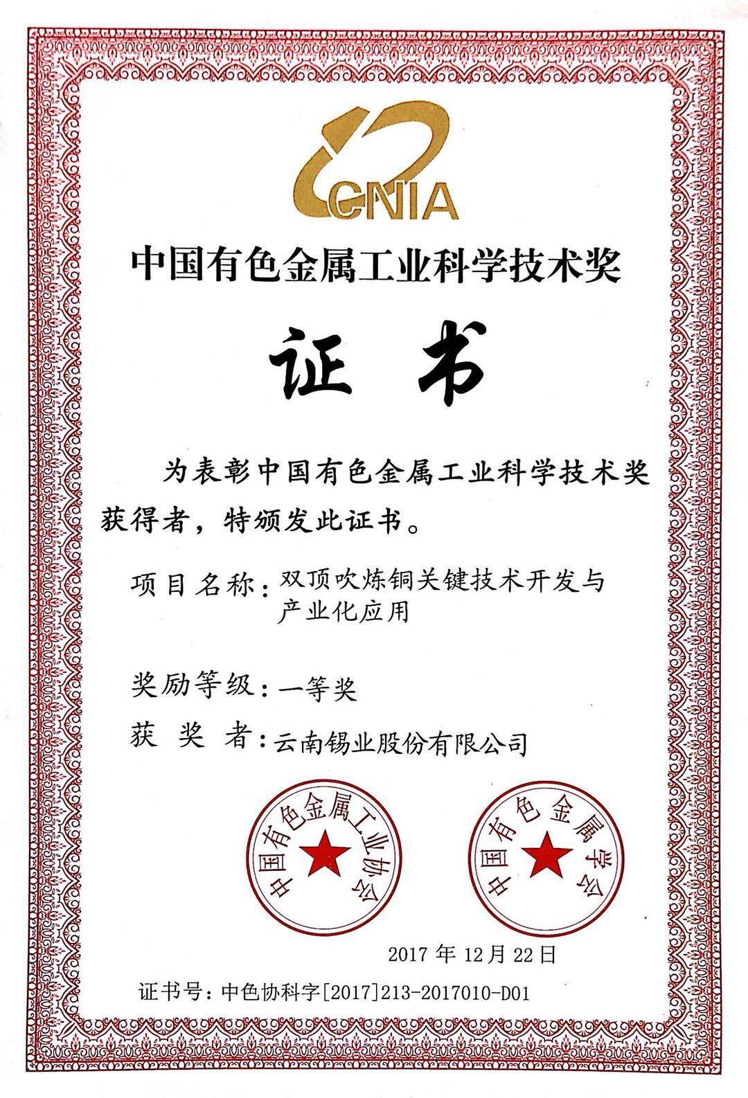 近日,经中国有色金属工业协会、中国有色金属学会评审及公示,云锡股份公司铜业分公司“双顶吹炼铜关键技术开发与产业化应用”荣获中国...