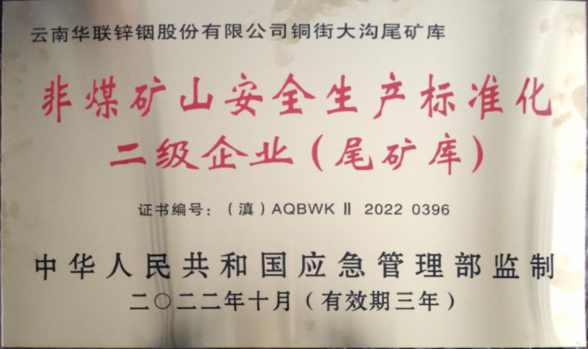 近日,华联锌铟公司铜街大沟尾矿库、新田尾矿库顺利获得“非煤矿山安全生产标准化二级企业”认定,并收到由中华人民共和国应急管理局监制、云南省应急管理厅颁发的牌匾和证书。为进一步落实企业安全生产主体责任,华联锌铟公司紧紧围绕“五个为零、两个确保、一个不超”的安全生产目标,严格贯彻落实《安全生产法》,切实履行“党政同责、一岗双责、齐抓共管、失职追责”的安全生产责任,通过全员全过程参与,使公司安全生产标...