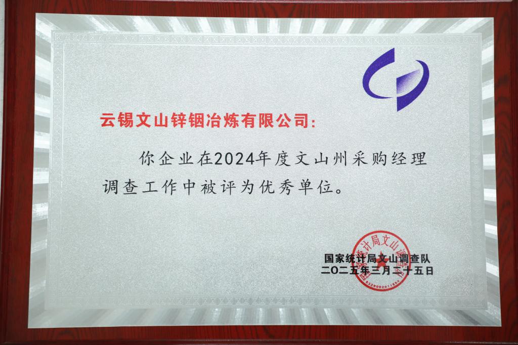 文山锌铟荣获2024年度文山州采购经理调查工作优秀单位
